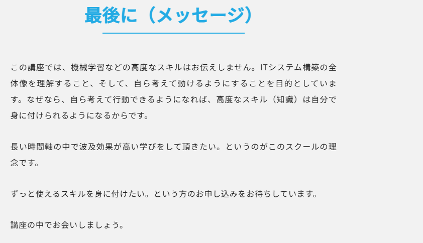 - 12週間という比較的短期間で「システム構築の全体像+実装スキル」が学べる構成なので、「早く学んで転職/副業を目指したい」「短期集中でスキルを身につけたい」という人には合いやすい。