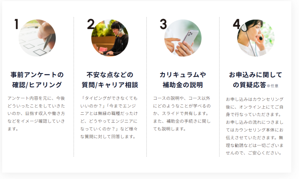 - カリキュラムの内容、学習ペース、支払い方法、給付金・補助金の適用可能性など、気になる点はここで確認可能です。