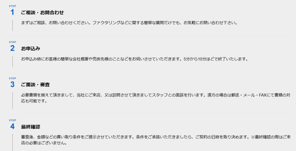 → 小規模・少額取引中心の企業だと使いづらい — 売掛金が少ないとファクタリング対象にならないかもしれない。 - 書類準備がやや煩雑/面談が必要な場合もある